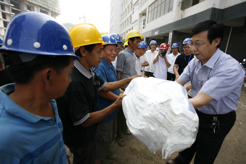 日前,我公司積極響應(yīng)市總工會號召,組織開展“關(guān)愛職工.夏送清涼”活動,為全公司4000余名農(nóng)民工送去T桖衫、毛巾,并為每個工地送去1000余斤西瓜及其他消暑物品。