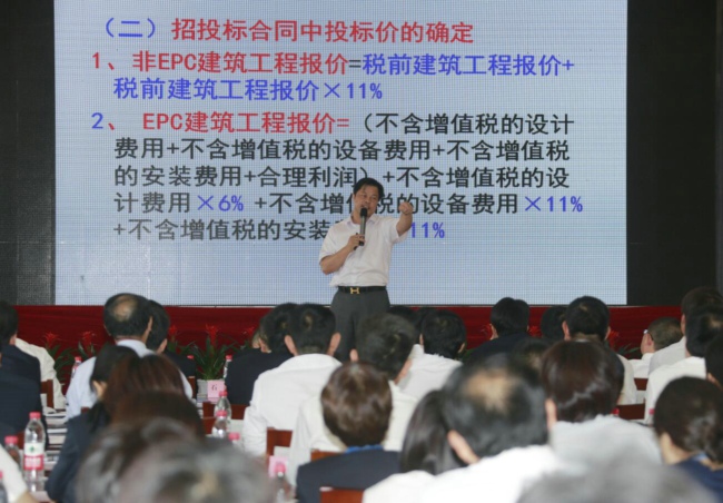 肖太壽博士就“營改增”后如何更好地推進(jìn)企業(yè)發(fā)展與參會(huì)學(xué)員進(jìn)行了深入交流,對“營改增”相關(guān)政策文件進(jìn)行了重點(diǎn)解讀,對合同管理、資金管理、財(cái)務(wù)管理、工程造價(jià)、材料采購及實(shí)務(wù)操作等工作給予提示性講解,并對現(xiàn)場學(xué)員提出的疑難問題進(jìn)行了解答。學(xué)員們仔細(xì)聆聽,認(rèn)真記錄,學(xué)習(xí)熱情高漲、現(xiàn)場氣氛熱烈,達(dá)到了預(yù)期的效果。